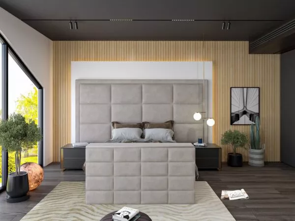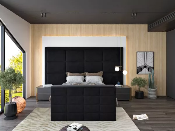 Floor-standing headboard with an overhang of 60cm on either side for a grand aesthetic