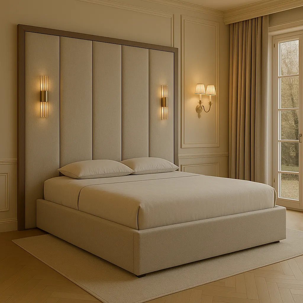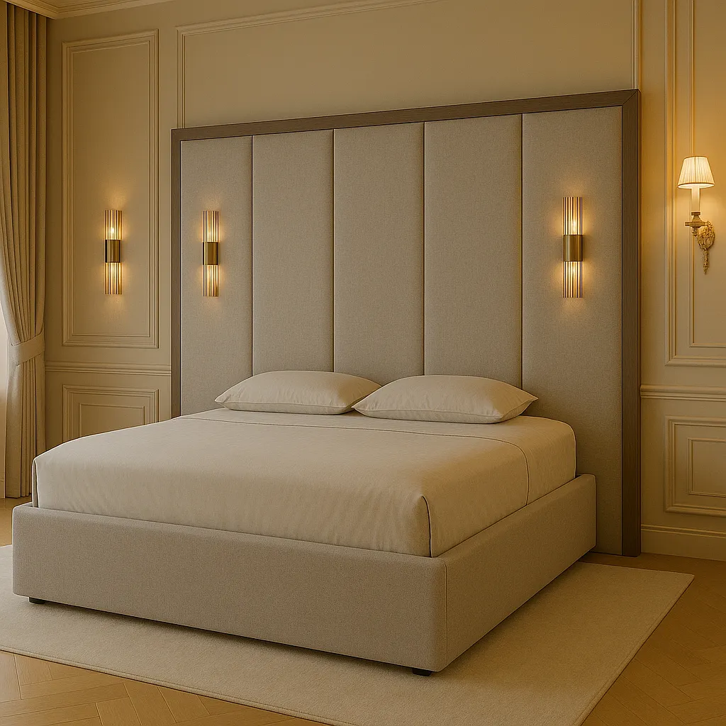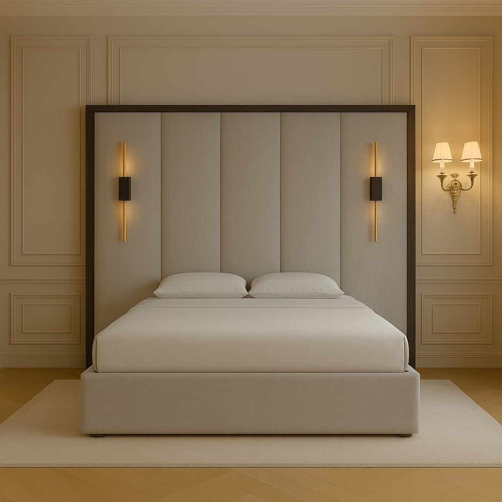 Introducing the Chicago wooden trim bed – a handcrafted statement piece designed to elevate any modern bedroom. Featuring an oversized, fully upholstered headboard with five beautifully padded vertical panels, this bed blends contemporary styling with hotel-inspired elegance. The bold outer wood trim creates a striking architectural frame, while the slim integrated brass wall lights add a warm, ambient glow.