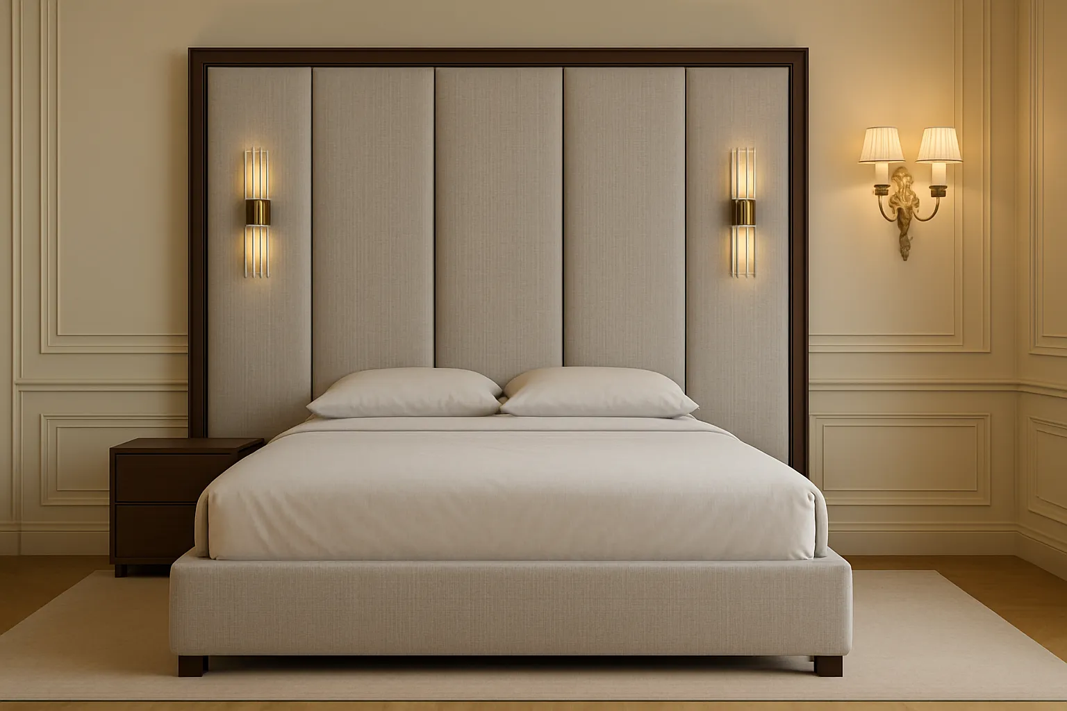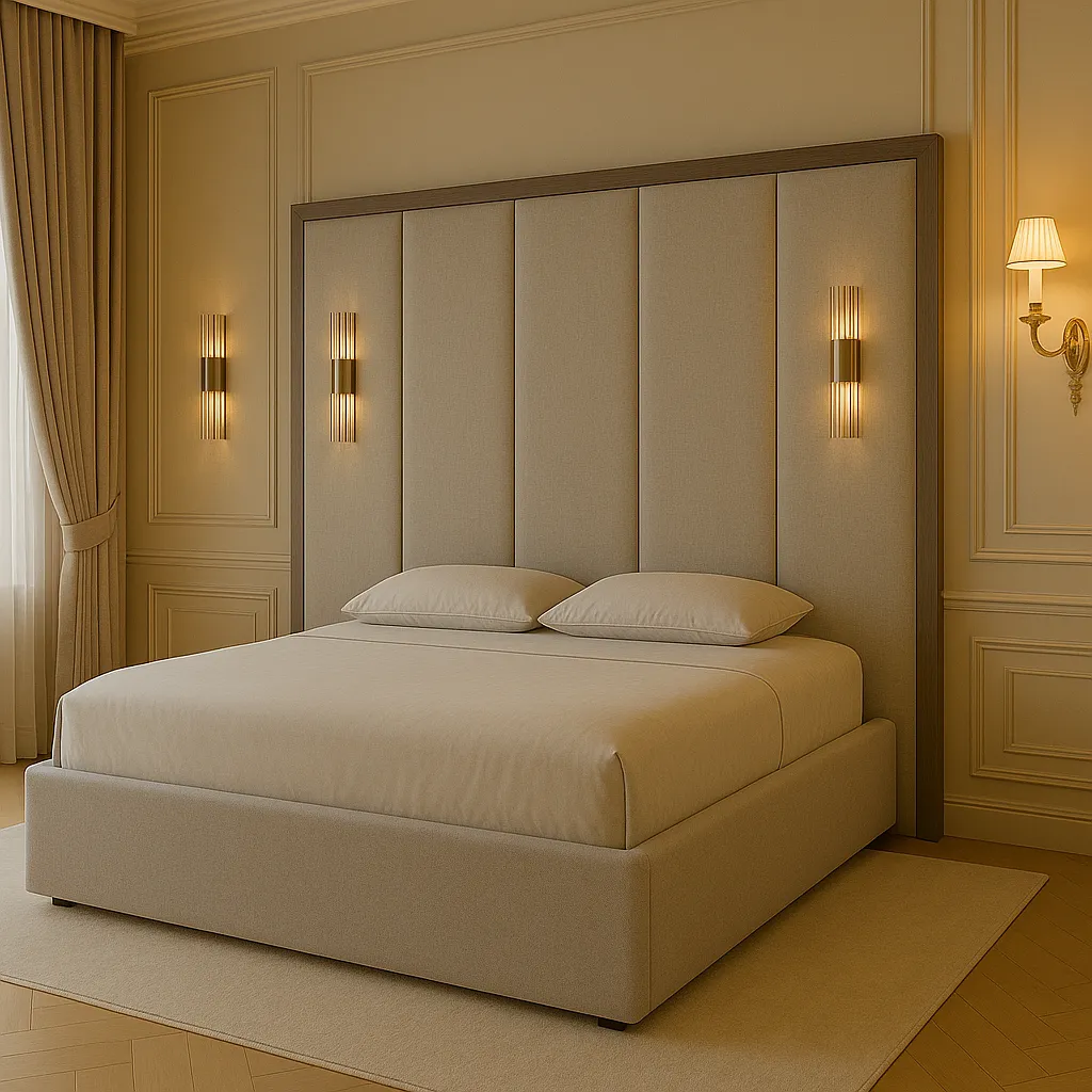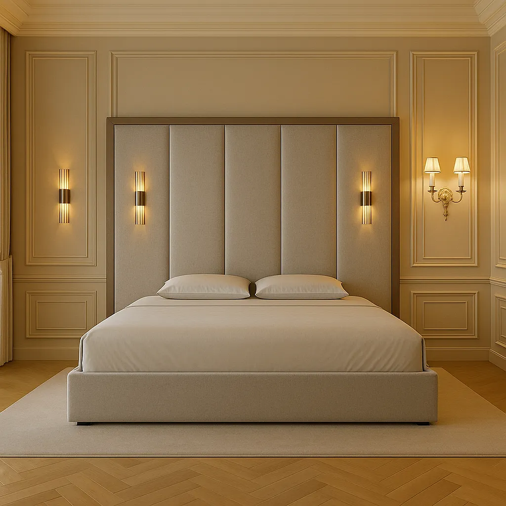 Introducing the Chicago wooden trim bed – a handcrafted statement piece designed to elevate any modern bedroom. Featuring an oversized, fully upholstered headboard with five beautifully padded vertical panels, this bed blends contemporary styling with hotel-inspired elegance. The bold outer wood trim creates a striking architectural frame, while the slim integrated brass wall lights add a warm, ambient glow.