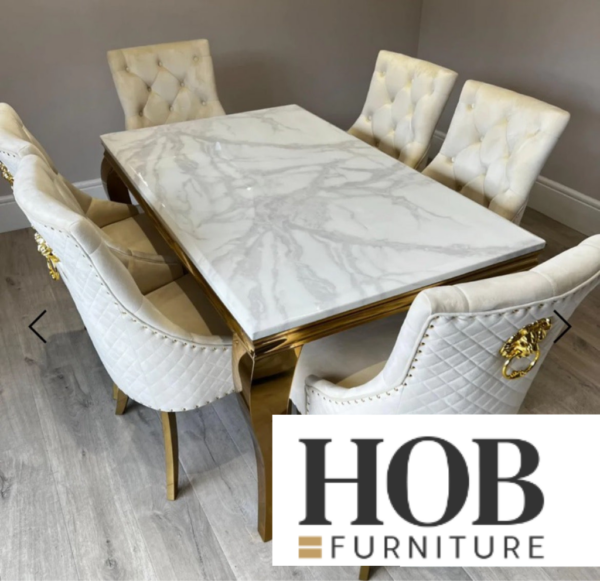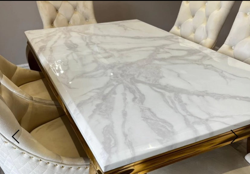 1.6 meter x 90 cm meter white glass table with beautiful gold base and matching chairs