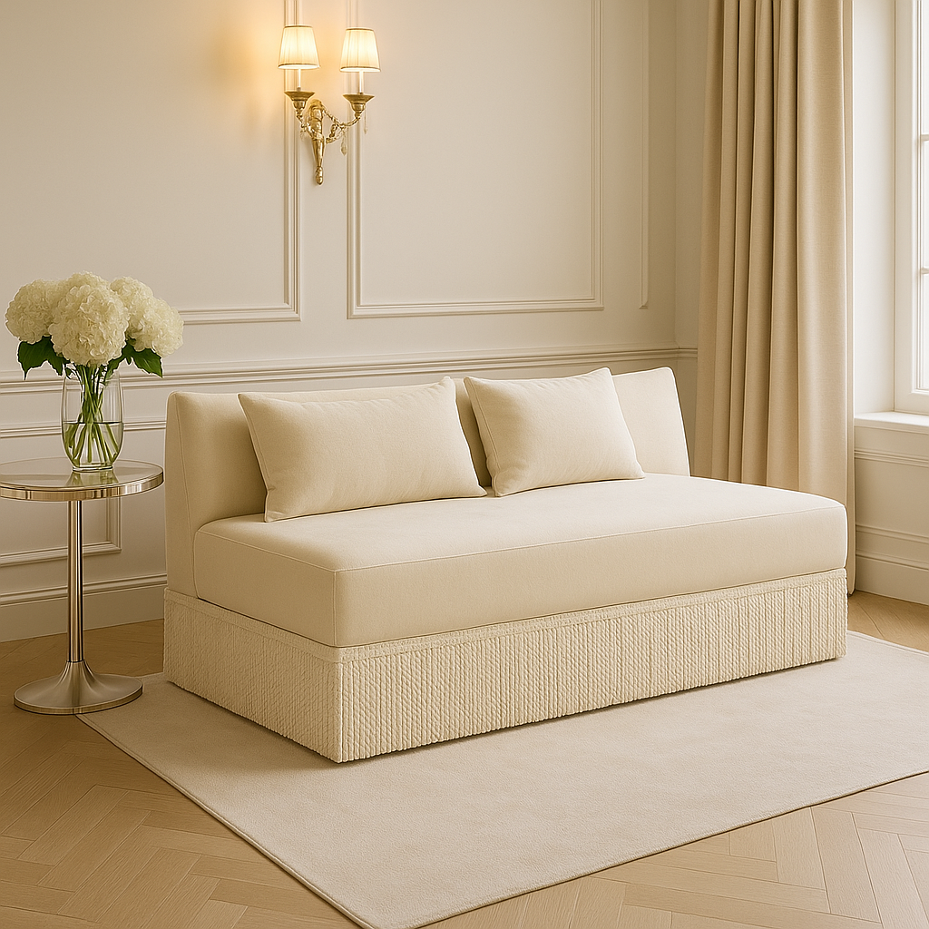 The minimalist seat profile is complemented by a hand-woven textured base, offering a beautiful contrast of materials and adding artisanal detail. Its deep cushioning and supportive back pillows provide exceptional comfort whether used as a reading nook, end-of-bed bench, or statement seating in a luxury suite.